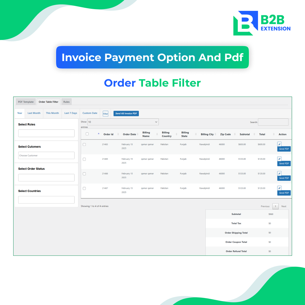 - Order Table Filters: Filter orders by user role, customer, order status, and more to control where and when invoice payment options appear.