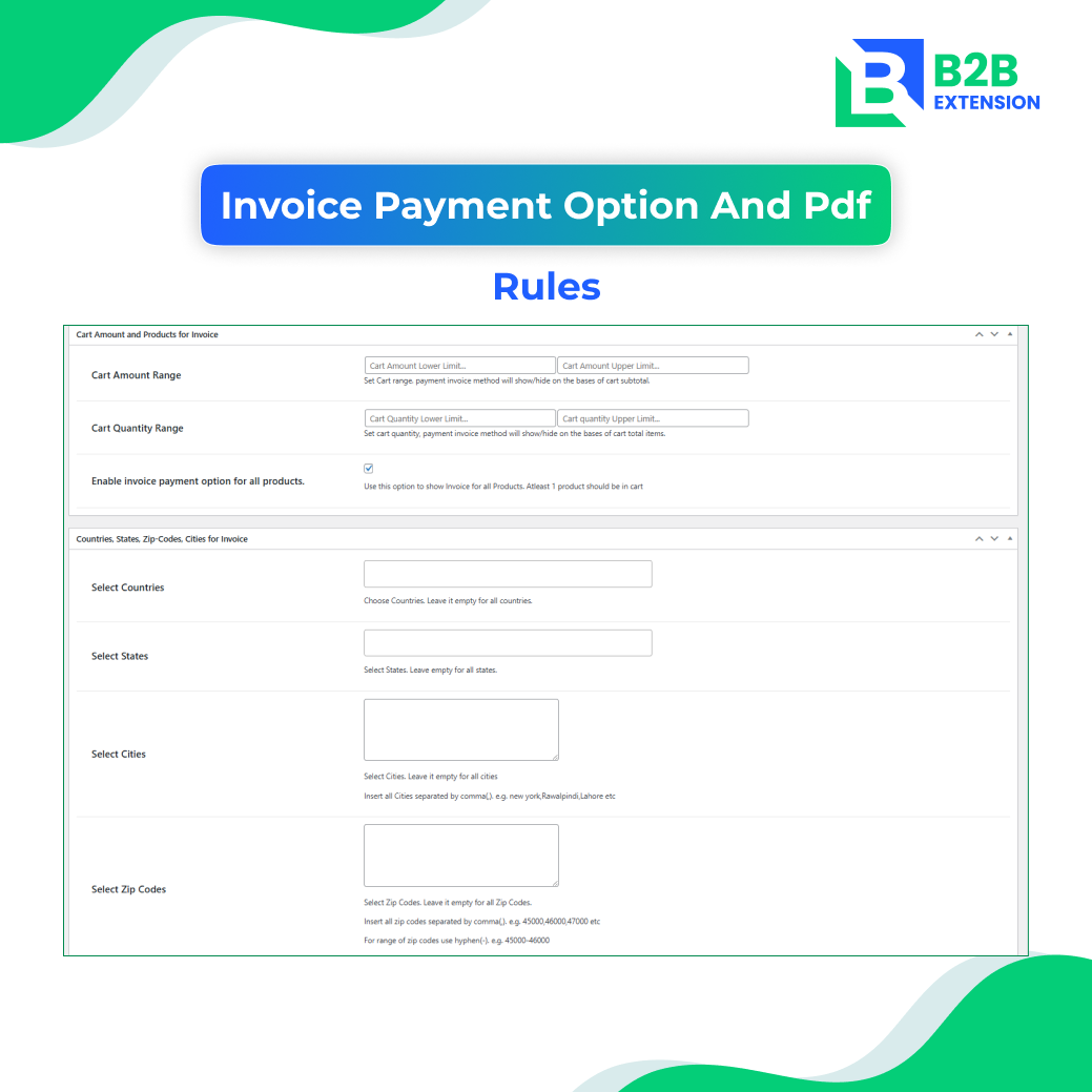 - Shipping Method Rules: Control when the invoice payment option is available based on selected shipping methods.